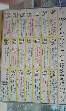 2回のコーナーの片隅には・・・机が。 その前には魚の名前の漢字が……。 読めないよっ(爆笑)